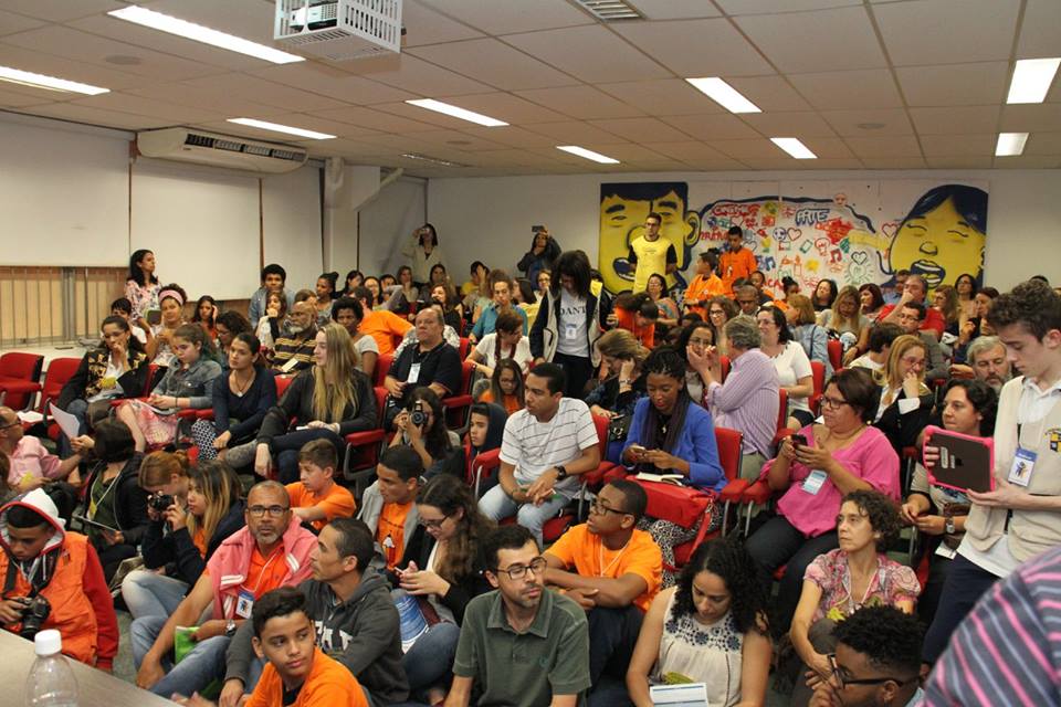 Imagem do Encontro ‘Vozes da Infância e Juventude’, realizado no VII Educom. Auditório lotado com crianças, jovens e adultos para discutir educomunicação ilustra a legitimação do conceito em diferentes escalas